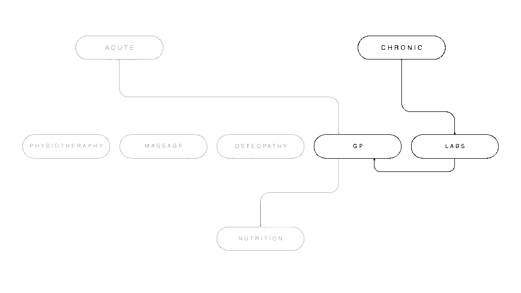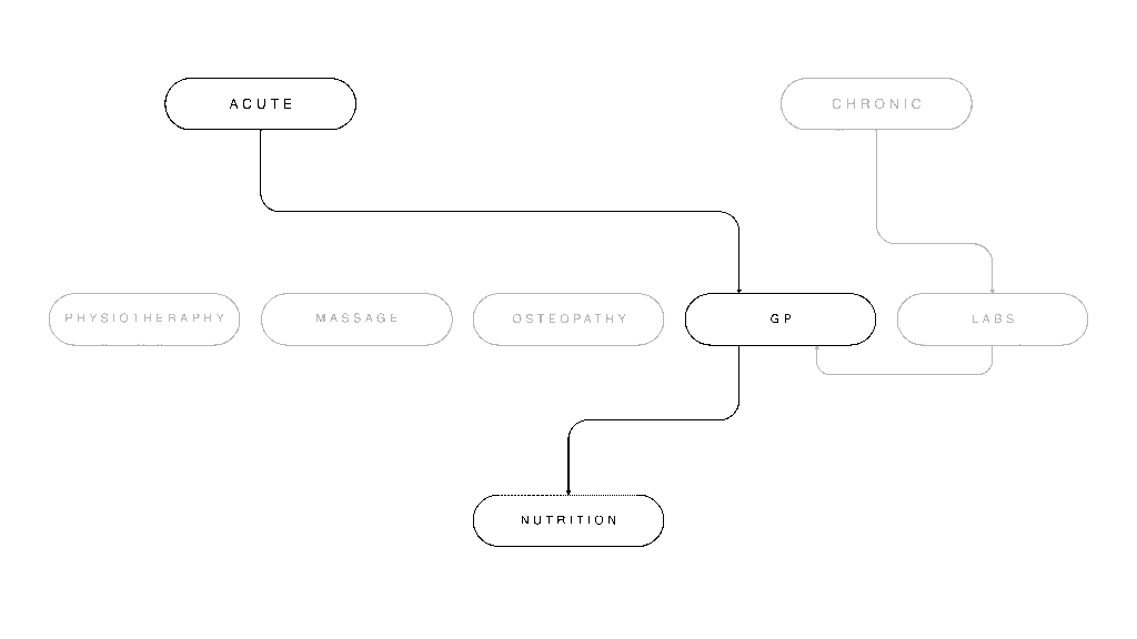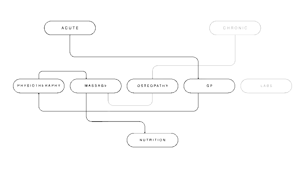 Physiotherapy treats acute injuries (present less than 6 weeks) of mostly the musculoskeletal system. Back/neckpain, a sprained ankle or postoperative care for example is all work for this speciality.
