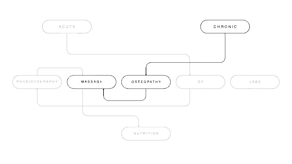 Our osteopathy services treats chronic issues (problems present more than 6 weeks) with hands-on techniques. Osteopathy uses cranio-sacral, visceral and more specific techniques than standard physiotherapy.